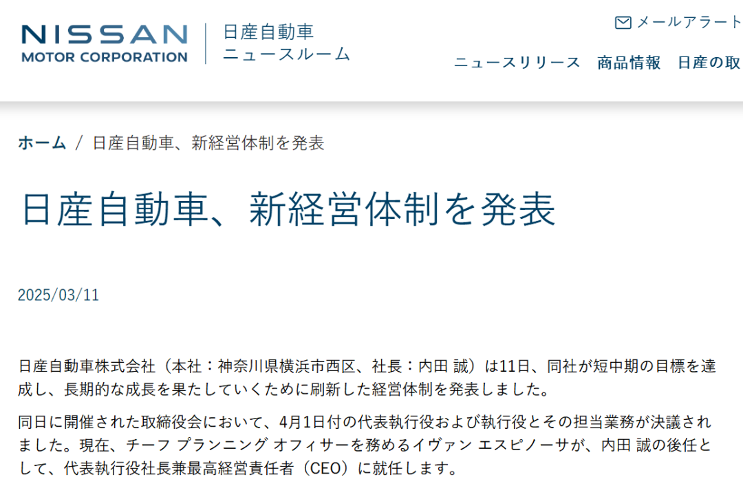 3月11日,日产汽车宣布,公司当日召开董事会会议,决定总裁兼首席执行官内田诚将于3月底卸任,继任者为公司首席规划官伊万·埃斯皮诺萨(Ivan Espinosa),4月1日起生效。事实上,自今年2月本田与日产合并谈判破裂后,就传出了内田诚地位不稳、日产有意换帅的消息。当时有知情人士透露,如果内田诚卸任,本田愿意恢复合并谈判,并称日产董事会已经开始就内田诚离职的时间进行非正式讨论。