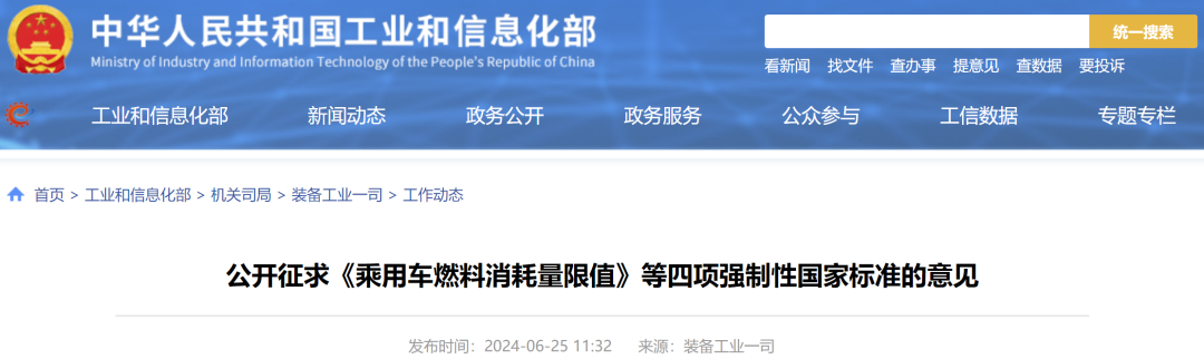 6月24日,工业和信息化部装备工业一司公布“公开征求《乘用车燃料消耗量限值》强制性国家标准的意见”。意见称,按照《中华人民共和国标准化法》和《强制性国家标准管理办法》,工业和信息化部装备工业一司组织全国汽车标准化技术委员会开展了《乘用车燃料消耗量限值》强制性国家标准的制修订,已形成征求意见稿,现公开征求社会各界意见。征求意见截止日期为2024年7月24日。《乘用车燃料消耗量限值》(征求意见稿)的主要内容除前言外包括:范围、规范性引用文件、术语和定义、型式认证的申请、燃料消耗量的测定、型式认证值的确定和记录、燃料消耗量限值、生产一致性、同一型式判定、实施日期,共十章,以及附录A(规范性)发动机系统特征说明;附录B(规范性)传统燃油车型燃料消耗量型式认证报告/型式认证申请报告;附录C(规范性)不可外接充电式混合动力车型燃料消耗量型式认证报告/型式认证申请报告;附录D(规范性)可外接充电式混合动力车型能量消耗量型式认证报告/型式认证申请报告,共四个附录。本文件适用于能够燃用汽油或柴油燃料、最大设计总质量不超过3500 kg的M1类车辆。本文件不适用于仅燃用气体燃料或醇醚类燃料的车辆。本文件代替GB 19578—2021《乘用车燃料消耗量限值》,与GB 19578—2021相比,除结构调整和编辑性改动外,主要技术变化如下:a) 调整了车型燃料消耗量限值;b) 更改了生产一致性相关要求;c) 删除了更改和认证扩展要求;d) 增加了同一型式判定条件;e) 增加了混合动力车型燃料消耗量型式认证报告/型式认证申请报告(见附录C、附录D)。标准修订是保障国家能源安全的必然需要。据统计,2023 年我国原油进口量超过5.64 亿吨,对外依存度约73%,其中车用燃油消耗占社会表观汽柴油消耗超80%。持续加严乘用车燃料消耗量标准,促进汽车燃料经济性水平不断提升、减少石油资源消耗,成为保障国家能源安全的重要手段。标准修订是支撑2030 年碳达峰目标的重要途经。按照《2030年前碳达峰行动方案》相关要求,制定面向未来更加严格、科学的乘用车燃料消耗量标准,淘汰高排放的落后产品,促进先进节能低碳技术应用,将有效支撑汽车行业2030 年前碳排放达峰,也成为缓解汽车工业快速发展与生态文明建设之间矛盾的重要途径。标准修订是加快汽车工业转型升级的手段。目前我国汽车产业处于转型升级、绿色发展的关键阶段,保持产品竞争力在全球市场更大发挥作用至关重要。目前欧盟、美国、日本等汽车工业发达国家均制定发布了下一阶段乘用车燃料消耗量标准法规,降低汽车CO2排放量,提升燃油经济性水平。从车型实际数据比较看,我国与欧盟、日本在乘用车油耗方面还存在一定差距,行业需要提高油耗标准。通过加严乘用车燃料消耗量限值,推动汽车产业转型升级,为我国汽车“走出去”提供支撑。标准修订是支撑汽车产业高质量发展的重要举措。2024 年3 月,国务院印发《推动大规模设备更新和消费品以旧换新行动方案》,指出:“加快完善能耗、排放、技术标准。加快乘用车、重型商用车能量消耗量值相关限制标准升级。”明确表示需加快提升汽车节能指标和市场准入门槛,即直接对本标准的修订提出了要求。推动汽车产品的以旧换新是加快构建汽车产业新发展格局、推动汽车产业高质量发展的重要举措,而限值标准的更新将有力促进投资和消费。乘用车燃料消耗量限值标准一直以来均是分阶段逐步制定实施,现版本GB 19578—2021实施周期为2021至2025 年。按照分阶段管理周期,本次修订标准将从2026年1月1日开始实施,考虑标准实施过渡期,给予行业充分的应对周期,有必要尽快完成标准制定发布。基于此并综合国际法规趋势,开展本标准项目修订工作。