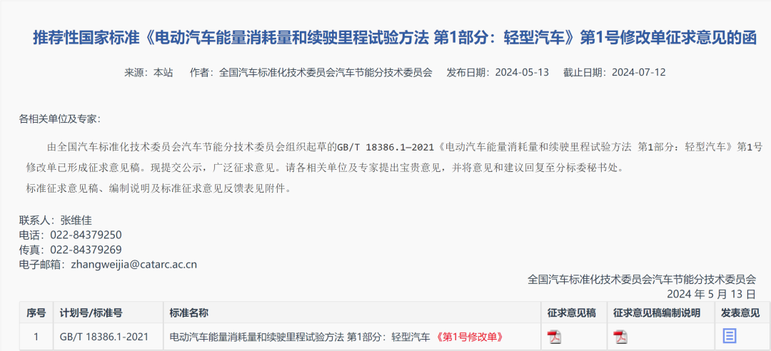 推荐性国家标准《电动汽车能量消耗量和续驶里程试验方法 第1部分:轻型汽车》第1号修改单征求意见的函