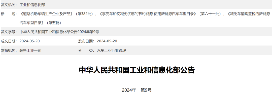 关于发布《道路机动车辆生产企业及产品》(第382批)、《享受车船税减免优惠的节约能源 使用新能源汽车车型目录》(第六十一批)、《减免车辆购置税的新能源汽车车型目录》(第五批)的公告