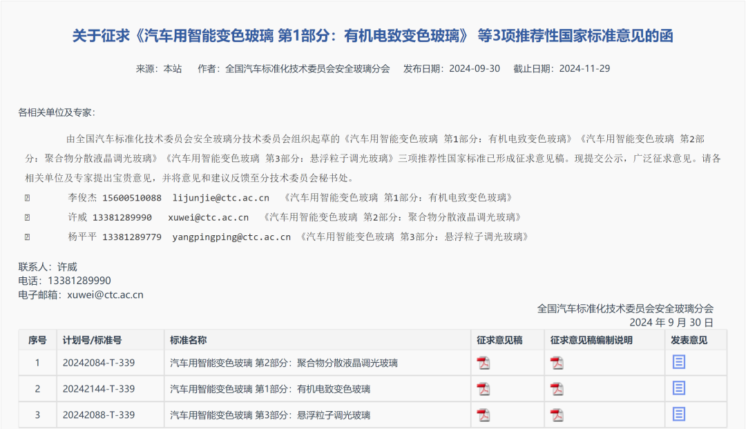 9月30日,全国汽车标准化技术委员会安全玻璃分会公布“关于征求《汽车用智能变色玻璃 第1部分:有机电致变色玻璃》 等3项推荐性国家标准意见的函”。函告称,由全国汽车标准化技术委员会安全玻璃分技术委员会组织起草的《汽车用智能变色玻璃 第1部分:有机电致变色玻璃》《汽车用智能变色玻璃 第2部分:聚合物分散液晶调光玻璃》《汽车用智能变色玻璃 第3部分:悬浮粒子调光玻璃》三项推荐性国家标准已形成征求意见稿。现提交公示,广泛征求意见。征求意见截至日期:2024年11月29日。《汽车用智能变色玻璃 第1部分:有机电致变色玻璃(征求意见稿)》的主要内容除前言外包括:范围,规范性引用文件,术语和定义,分类,技术要求,试验方法,检验规则,包装、运输和贮存,共八章。本文件规定了汽车用有机电致变色玻璃的术语和定义、要求、试验方法、检验规则以及包装、标志、运输和贮存。本文件适用于在汽车上作为车窗使用的以有机材料作为电致变色介质的汽车智能变色玻璃。本文件严格遵照GB/T 1.1-2020《标准化工作导则 第1部分:标准化文件的结构和起草规则》的有关规定起草。本文件的编制紧密结合超薄玻璃行业发展需要,结合汽车智能变色玻璃产业发展需求,使本文件具有系统性和先进性。本文件按照有机电致变色玻璃相关的技术理论,以促进行业发展与技术进步为导向,为汽车智能变色玻璃测量技术提供必要的技术参数,解决智能玻璃综合性能评价难题,并充分考虑了多种类型玻璃的科研与生产方面的需要,使本文件具有适用性和可操作性。本标准制定后将有效推动汽车用电致变色玻璃的发展,具体可归纳为以下几点: 1)通过以点带面的方式促进汽车用电致变色玻璃行业的发展并推动智能玻璃行业技术的整体进步; 2)标准制定后,汽车玻璃厂家、原材料和技术提供方、汽车主机厂将有标准可依,解决目前只以合同作为判定依据或以经验作为判定依据的现状,能够加快汽车用变色玻璃国内厂家的发展,减轻其相应的研发费用和推广费用; 3)有利于汽车主机厂和消费者使用该类新型产品,并建立起对产品质量的信心,将给整个产业注入一支强心剂,对该细分产业的发展具有非常重大的意义; 4)同时减少未来因质量问题产生的纠纷,即使产生纠纷也有标准可依,能够通过检测机构和法院进行评价,减少社会矛盾,为建设和谐社会增添一份力量。 于前文所示,该类电致变色玻璃产品不仅可以用在交通工具领域,也可用在建筑领域和电子领域(如手机已有应用),其基础性能和定义类似,如变色时间的定义和测量方法、变色范围的定义和测量方法。本标准将协调这些基础性的定义和测量方法,但也由于汽车行业的特殊性,其测量方法和要求也需要进行相应的改进和优化,在不产生矛盾的基础上,提出符合汽车领域特殊性的新的要求或改进原来的力学、电学和耐久性要求。《汽车用智能变色玻璃 第2部分:聚合物分散液晶调光玻璃(征求意见稿)》的主要内容除前言外包括:范围,规范性引用文件,术语和定义,技术要求,试验方法,检验规则,包装、运输和贮存,共七章。本文件规定了汽车用聚合物分散液晶调光玻璃的术语和定义、要求、试验方法、检验规则以及包装、运输和贮存。本文件适用于在汽车用聚合物分散液晶调光玻璃。汽车用聚合物分散液晶调光玻璃产品在国内外已由近百余家企业进行相关技术和产品的研发,国内则有15家左右技术和成品提供方,相关产品已应用在上汽、宇通、广汽、东风、北汽等多家新能源或传统车企。随着新能源车的大规模普及,汽车用聚合物分散液晶调光玻璃产品的普及也将加快。据了解,奥迪新款车型将标配聚合物分散液晶调光玻璃,届时将引领新的行业风向标,对整个汽车玻璃行业带来新的冲击和机遇。据估计,单一车型的应用面积就将达到50万平米/年。本标准发布后将进一步减轻汽车玻璃工厂、技术提供方的技术开发成本和汽车上下游的沟通成本。通过标准的实施,还可建立汽车主机厂与汽车玻璃加工厂和技术提供方的信任,促进产品的销售,并增强消费者的认可。本文件与我国现行强制性国家标准GB9656-2021《机动车玻璃安全技术规范》相协调。《汽车用智能变色玻璃 第3部分:悬浮粒子调光玻璃(征求意见稿)》的主要内容除前言外包括:范围,规范性引用文件,术语和定义,技术要求,试验方法,检验规则,包装、运输和贮存,共七章。本文件规定了汽车用悬浮粒子调光玻璃的术语和定义、要求、试验方法、检验规则以及包装、标志、运输和贮存。本文件适用于在汽车上作为车窗使用的以悬浮粒子作为变色介质的汽车智能变色玻璃。目前全球悬浮粒子变色玻璃产业规模已突破4亿美元,按照产业内预计在2030年将达到20亿美元规模。国内悬浮粒子变色玻璃企业主要集中在广州、浙江、福建、江苏等地区,超过十几家新型科技企业出现,有部分企业已经开始规模化生产,已经使用在豪华轿车和新能源汽车上。目前产能已可达10万片以上。在建厂房年产量可达百万平米/年。新能源汽车车企大量采用该类产品,目前广汽埃安品牌,北汽极氪、比亚迪海豹等品牌已有该类全景天幕可选装。另外铁锚、福耀等机车玻璃厂家已有产品在高铁玻璃上得到应用。