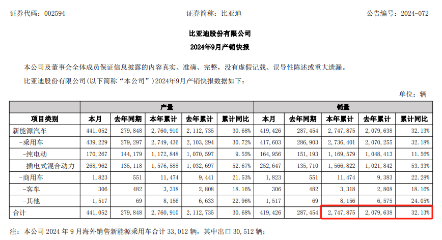 有分析称,比亚迪能取得上述成绩,主要依赖汽车业务快速增长。前三季度,比亚迪新能源汽车销量为274.79万辆,同比增长32.13%?。第三季度,比亚迪新能源汽车销量为113.49万辆,超过市场预期的110万辆。