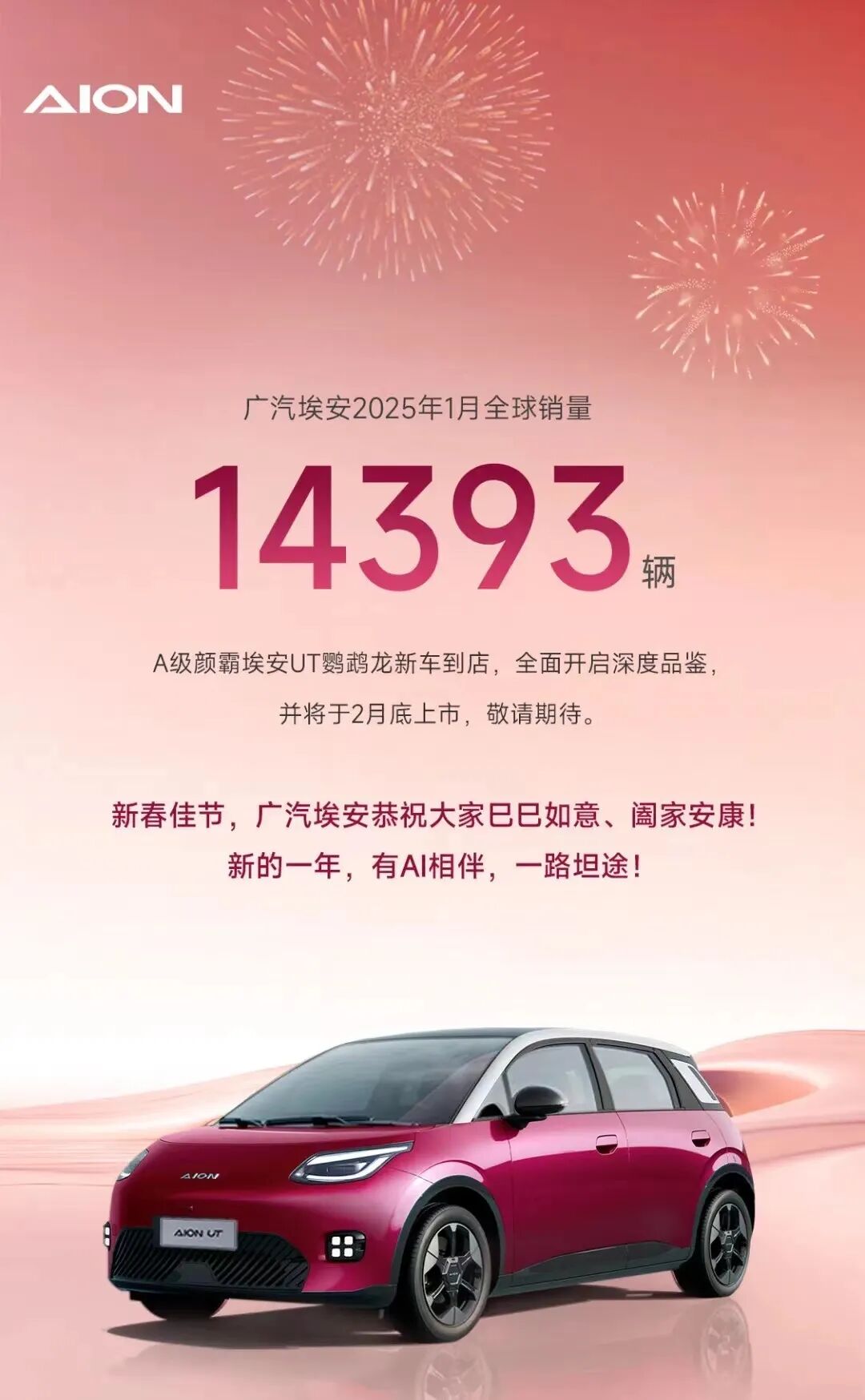 广汽埃安1月全球销量达到14393辆。同时,官方宣布埃安UT鹦鹉龙新车已到店,预计将于2月底正式上市。AION UT已于1月6日开启预售,推出三款车型,预售价区间为8.98万-10.98万元。