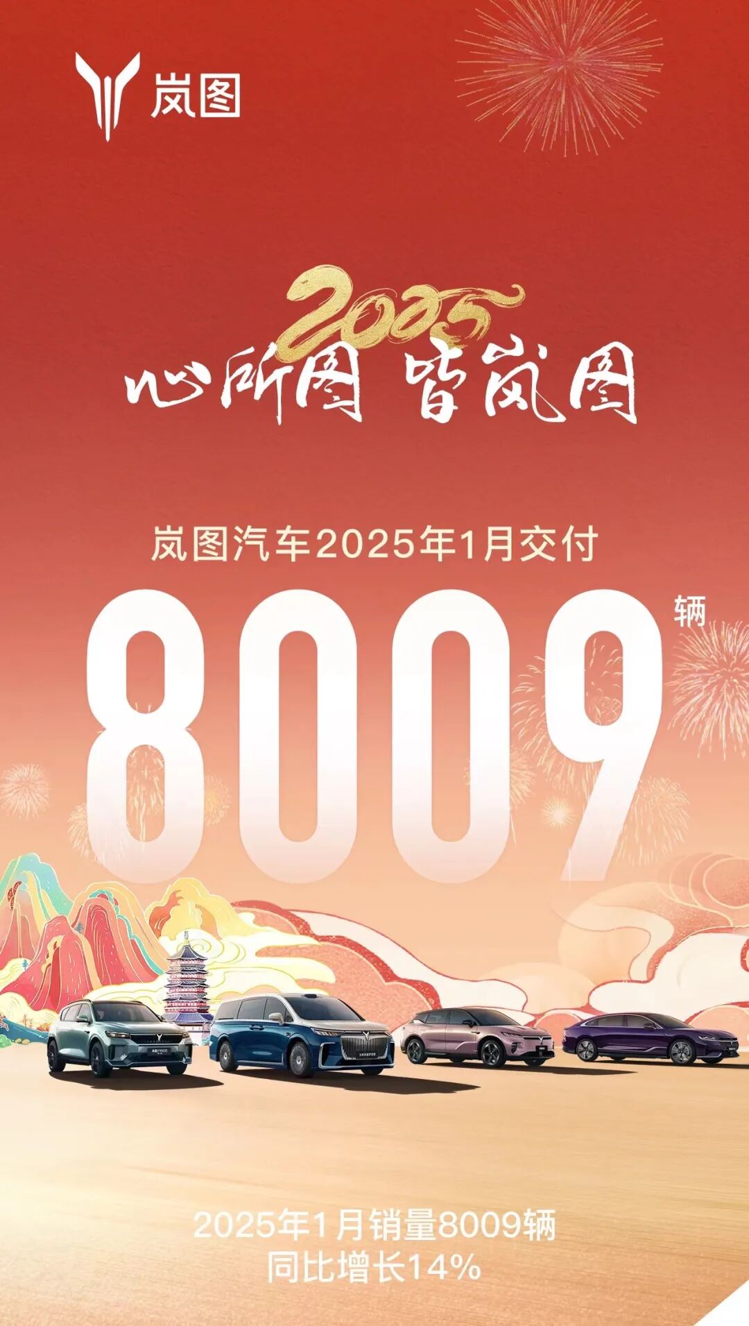 1月,岚图汽车交付8009辆,同比增长14%。岚图汽车CEO卢放表示,新年新开局,新年向更高目标前进。2024年,岚图汽车累计实现销量约8.57万辆,同比增长70%;2025年将推出4款以上全新或改款车,全年汽车销售目标锁定为20万辆。